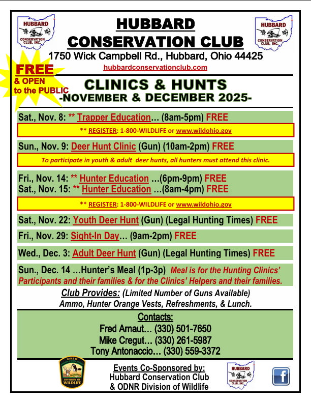 The Hubbard Conservation Club, in partnership with the ODNR Division of Wildlife, is offering a free Deer Clinic (Gun) and controlled hunts. These events are open to the public, and refreshments and lunch will be served. Attendance at the clinic is mandatory to participate in the hunts.