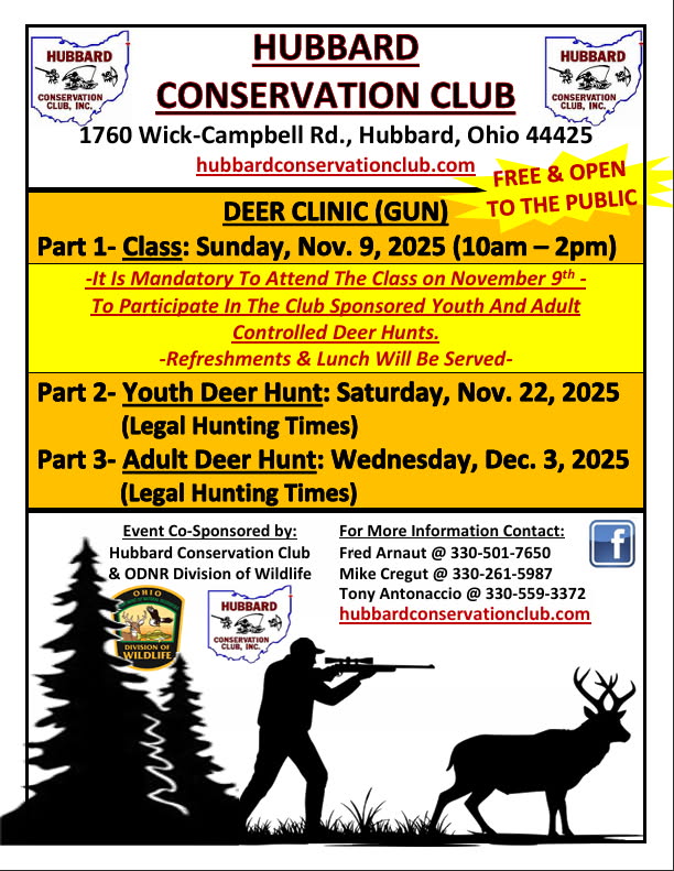 The Hubbard Conservation Club, in partnership with the ODNR Division of Wildlife, is offering a free Deer Clinic (Gun) and controlled hunts. These events are open to the public, and refreshments and lunch will be served. Attendance at the clinic is mandatory to participate in the hunts.
